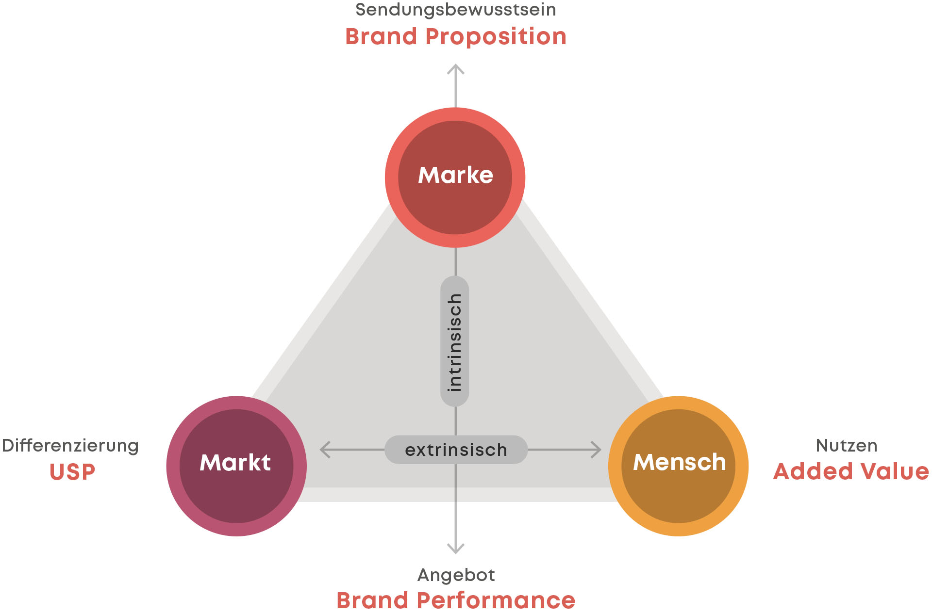 Das triadische Markenmodell verbindet alle entscheidenden Aspekte einer Marke zu einer kraftvollen Idee. Die Brand Proposition – das Nutzenversprechen – entwickeln wir in unseren Workshops von innen heraus. Doch dieses Versprechen ist nur so gut, wie es beim Publikum ankommt. Darum trimmen wir alle Erfolgsfaktoren einer Marke so, dass sie für ihr Publikum relevant und attraktiv ist. Gleichzeitig ist es entscheidend, dass eine Marke so eigenständig positioniert ist, dass sie ihre Nische überzeugend besetzt.