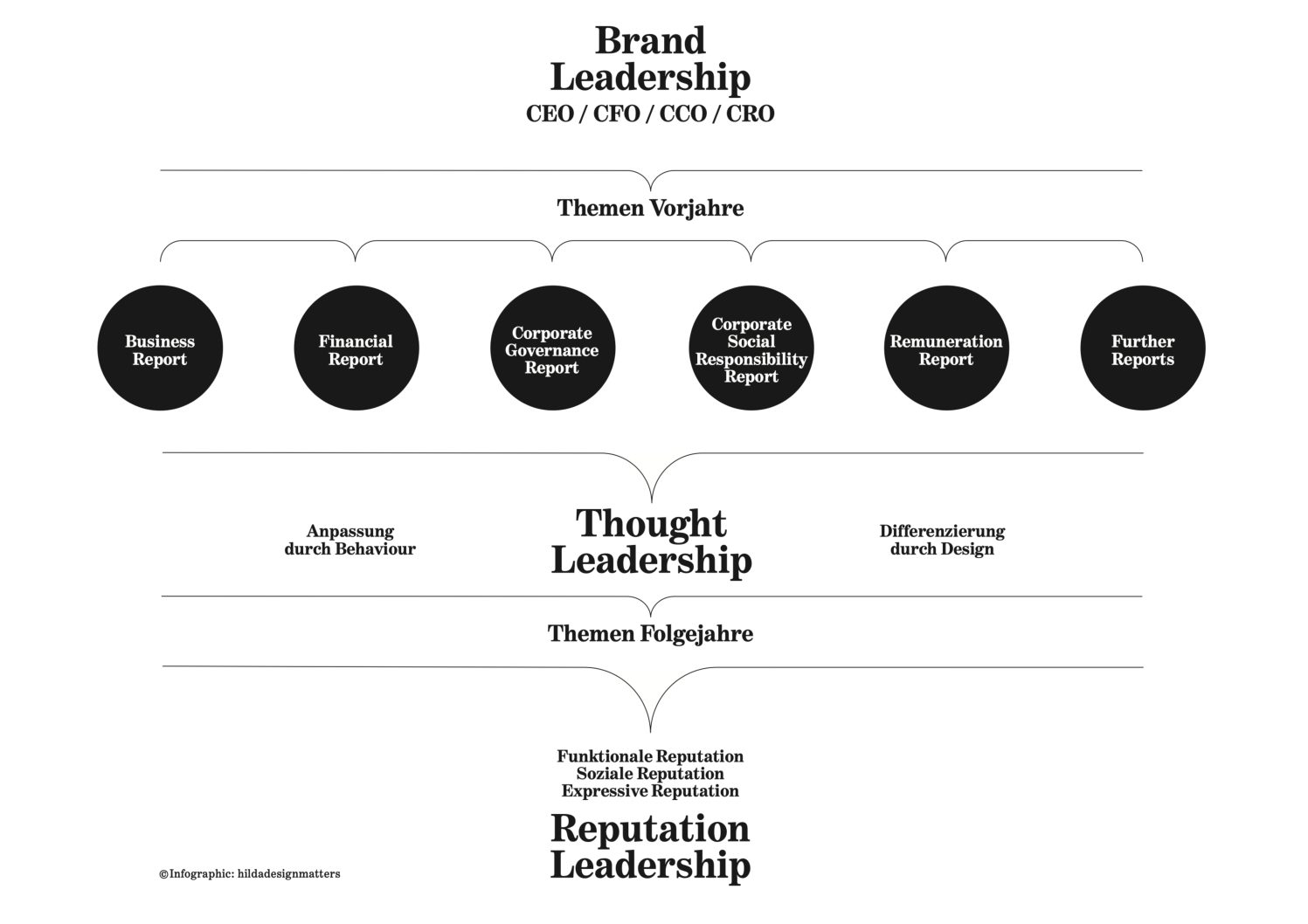 Das Reporting ist die Königsdisziplin der Unternehmenskommunikation. Denn im Reporting fallen alle Disziplinen der strategischen Markenführung zusammen. Die Erfahrung zeigt: Das effektivste Instrument, ein reputationsorientiertes Reporting aufzustellen, sind Workshops auf der Ebene des Topmanagements. Der Weg weist vom Brand Leadership über die Thought Leadership zur Reputation Leadership.